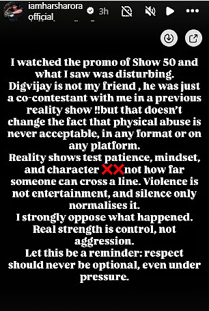 “मैंने ‘शो 50’ (The 50) का प्रोमो देखा और जो मैंने देखा वह काफी परेशान करने वाला था। दिग्विजय मेरा दोस्त नहीं है, वह पिछले एक रियलिटी शो में मेरे साथ सिर्फ एक सह-प्रतियोगी (co-contestant) था!! लेकिन इससे यह तथ्य नहीं बदल जाता कि शारीरिक शोषण (physical abuse) कभी भी स्वीकार्य नहीं है, चाहे वह किसी भी फॉर्मेट या प्लेटफॉर्म पर हो।